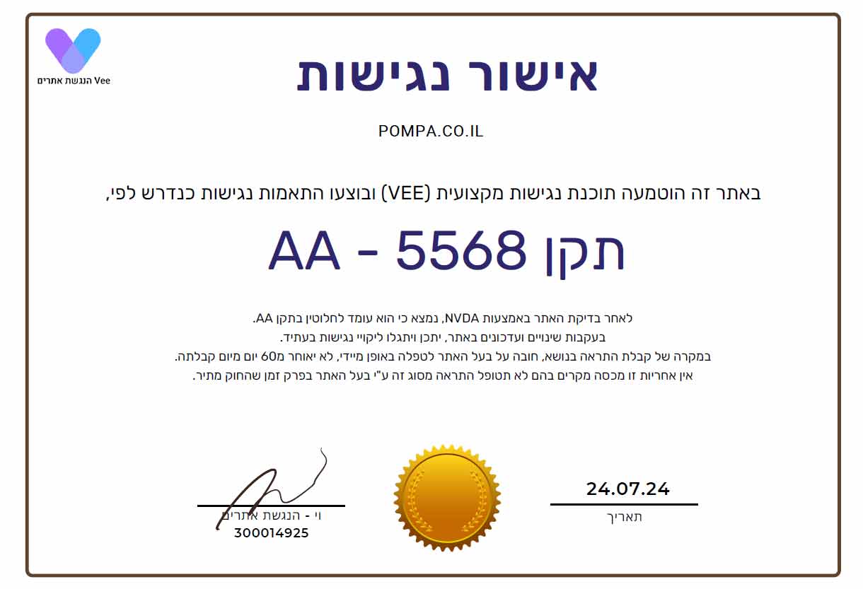 אלקטריק פומפה סחר בע"מ, אחראית על הקמת והפעלת אתר : https://www.pompa.co.il . אנו רואים חשיבות רבה במתן שירות שוויוני לכלל האזרחים ובשיפור השירות הניתן לאזרחים עם מוגבלות.